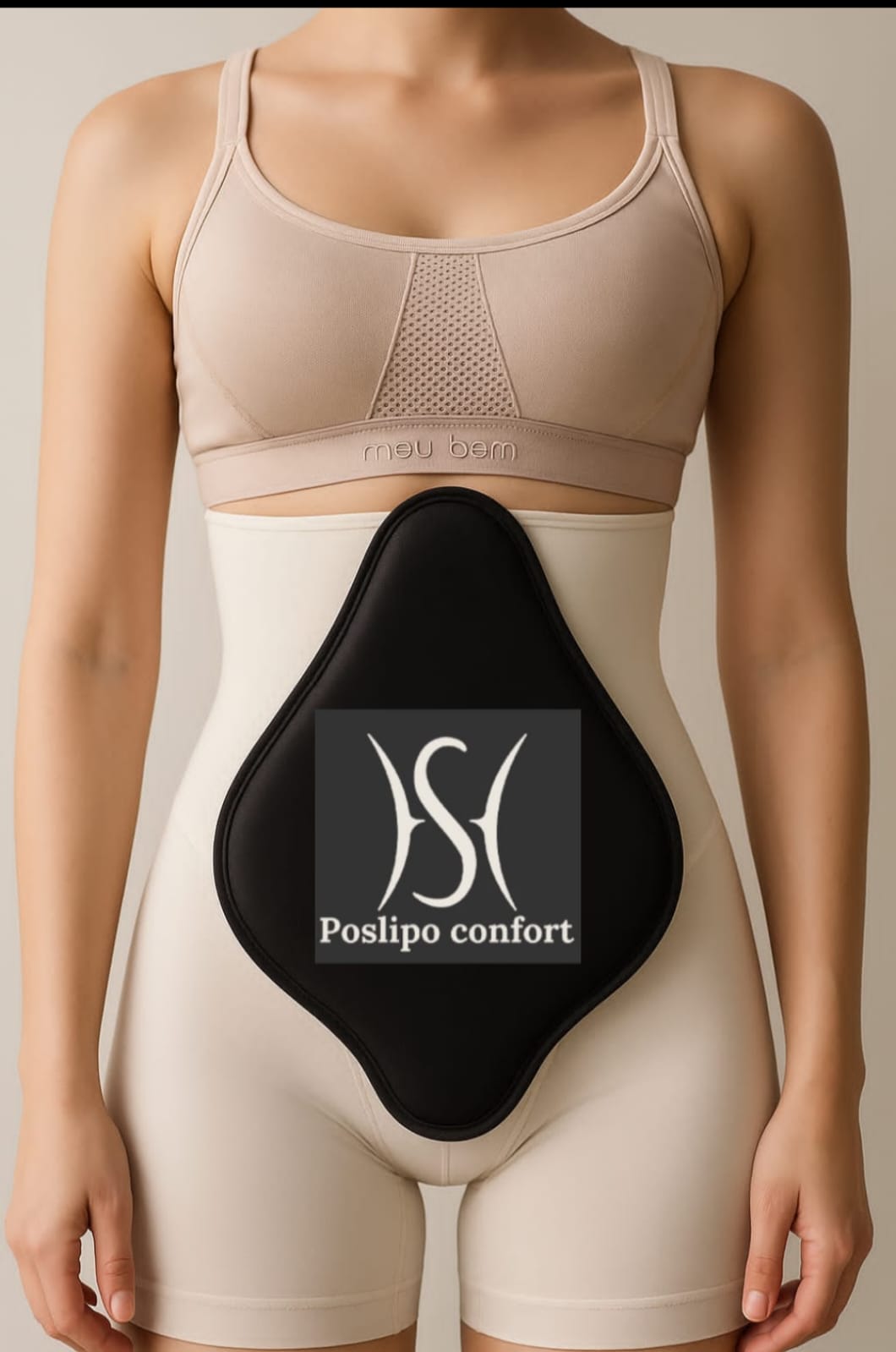 Su diseño en forma de campana cubre estratégicamente el área abdominal baja, incluyendo el pubis, ofreciendo una mayor protección y definición en una de las zonas más delicadas del postoperatorio.